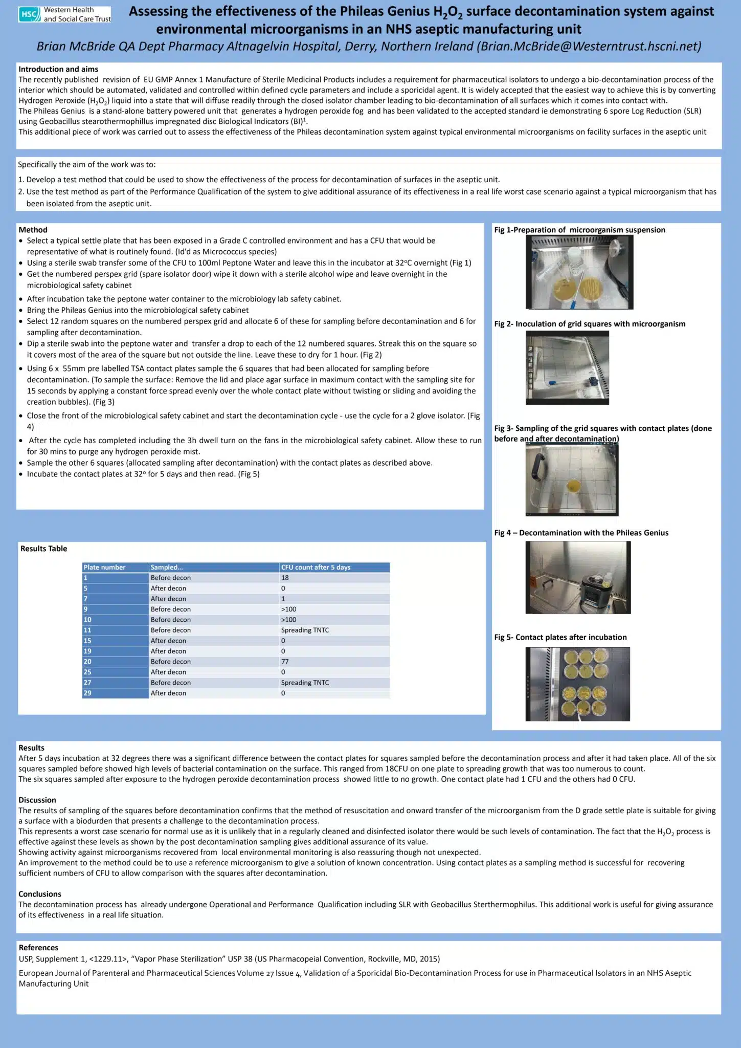 Brian McBride, Quality Assurance Pharmacist at Altnagelvin Hospital in Ireland, published his disinfection validation work in the peer-reviewed journal EJPPS in January 2023. He also presented his findings at the French congress ContaminExpo in Paris in March 2023.